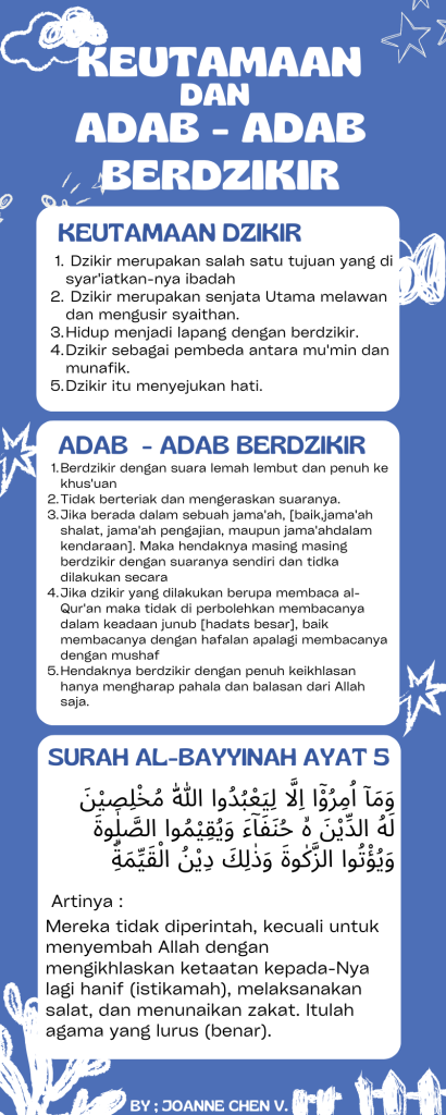 This poster on the side is a poster I made with Canva. In it there is material about Adab training, namely “The virtues and adab-adab of dhikr”. The virtues of dhikr contain five numbers, the adab of dhikr contains 5 numbers as well, and the verse and meaning of surah Al-bayyinah verse 5.